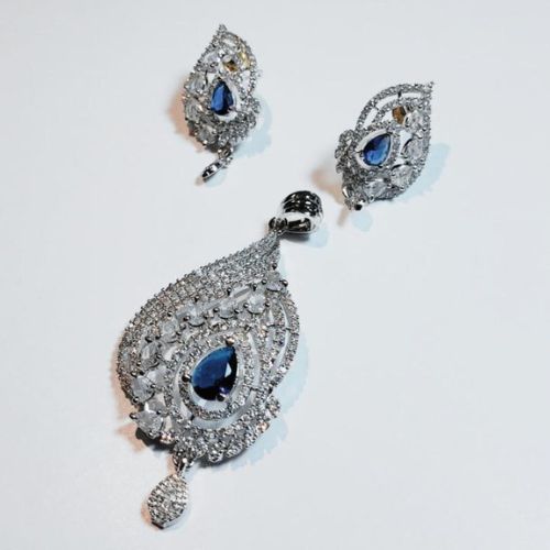 Rhodium-Plated Teardrop American Diamond Necklace & Earrings Set – Silver Toned